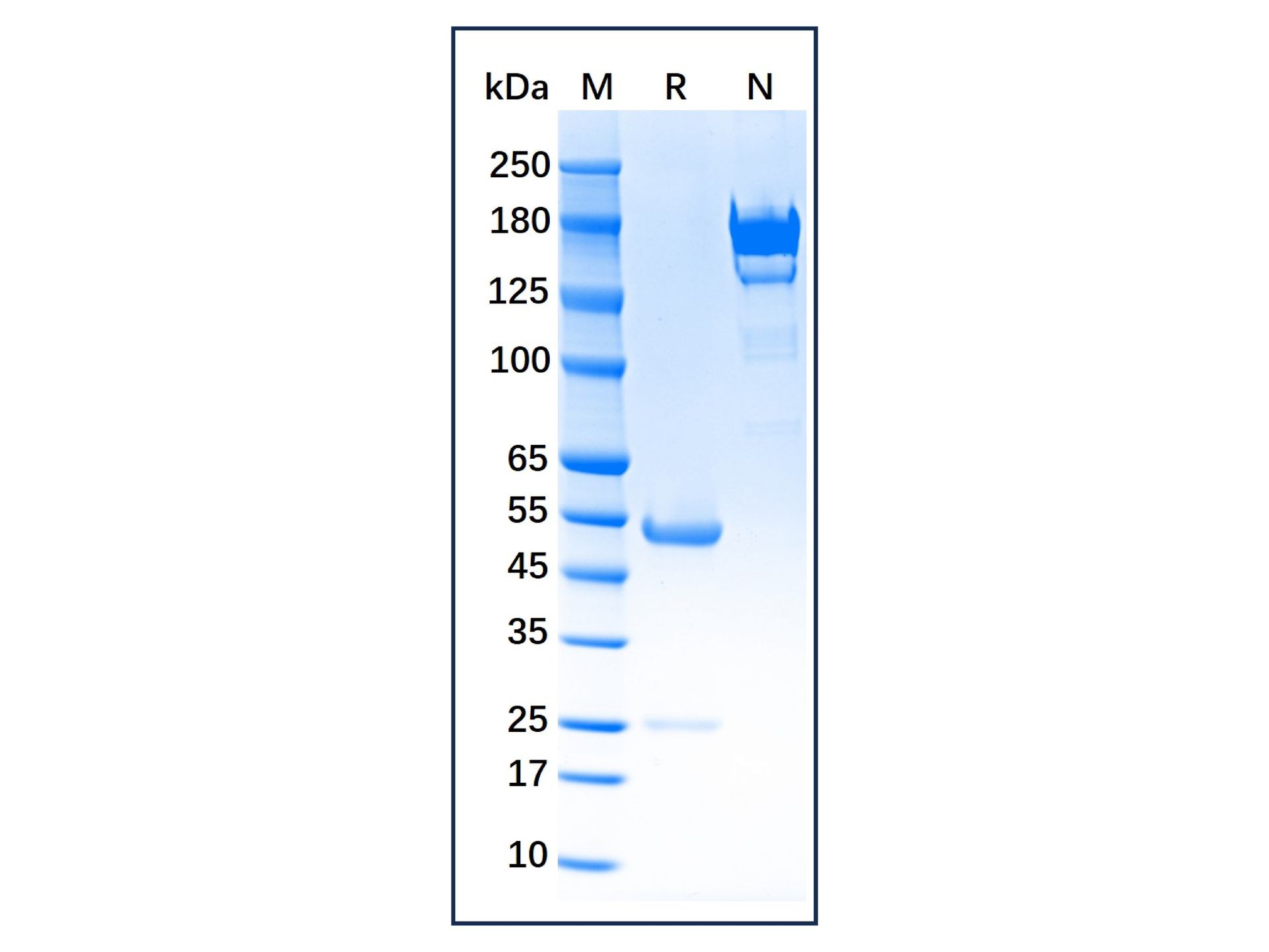 3 μg/lane of Myeloperoxidase Mouse mAb (Ab005456) was resolved with SDS-PAGE under reducing (R) and non-reducing (N) conditions and visualized by Coomassie® Blue staining, showing the band at 25.1 kDa (Light Chain) & 51.7 kDa (Heavy Chain) under reducing conditions and 164.8 kDa under non-reducing conditions.