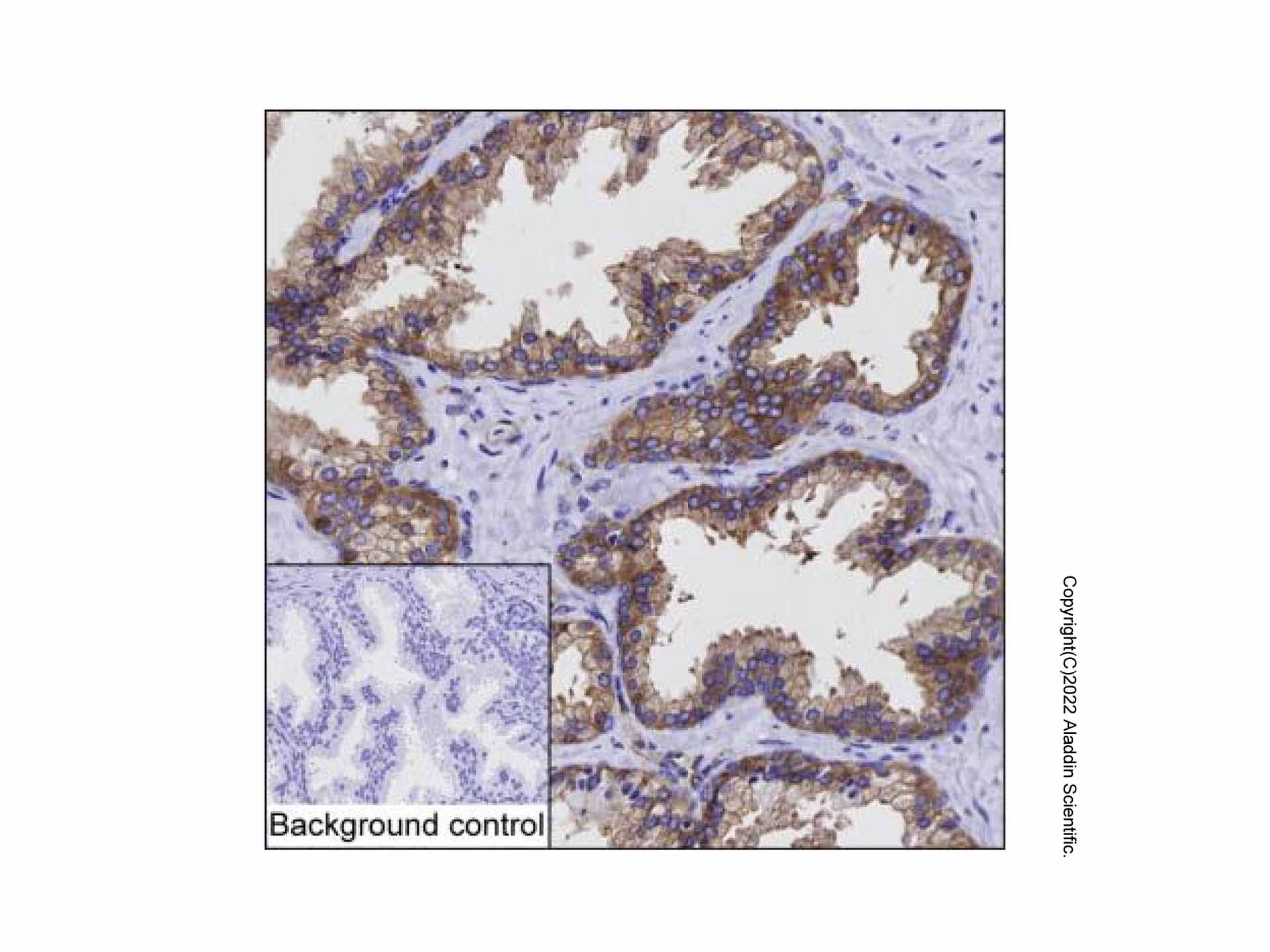 IHC was performed using sections of the formalin-fixed paraffin-embedded prostate tissue. Antigen was retrieved through addition of boiling Tris/EDTA buffer pH 9.0 in a pressure cooker for 3 min. Endogenous peroxidase activity was quenched by incubating the sections with 3% H2O2 for 30 min at room temperature. The sections were then incubated with PAK4 Mouse mAb (Ab120121) at 5 µg/mL at room temperature for 1 h. Poly-peroxidase conjugated goat anti-mouse IgG was used as the secondary antibody. Diaminobenzidine was used as the chromogen. The section was counterstained with hematoxylin. A tissue section incubated with phosphate-buffered saline followed by incubation with the secondary antibody was used as the background control.