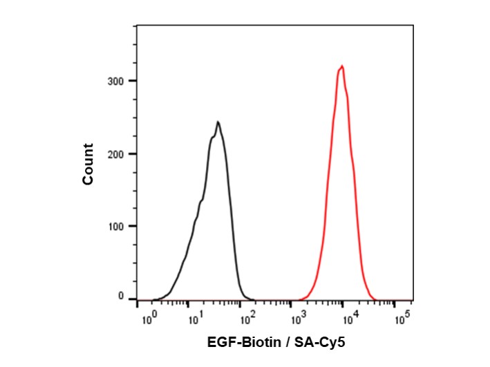 Flow analysis of EGF receptors (red line) in A431 Cells. Cells were labeled with Recombinant Human EGF Protein (Biotin) (rp170191) at 1/2500 dilution for 1 hour at 4°C, and then incubated with Recombinant Streptavidin Protein (Cy5) (rp169047) at a dilution of 1/1000 for 30 minutes at 4°C in the dark. Unlabeled Cells (black line) were used as a negative control.