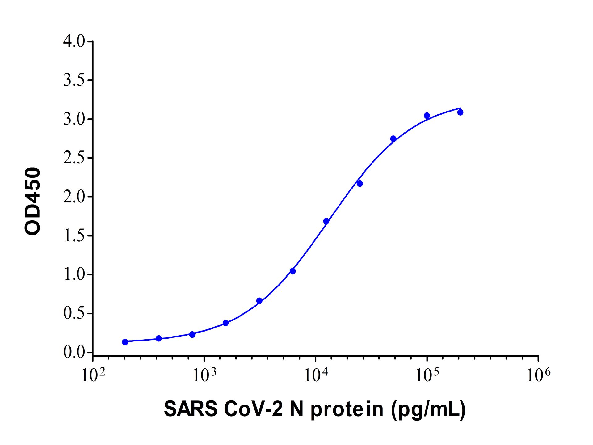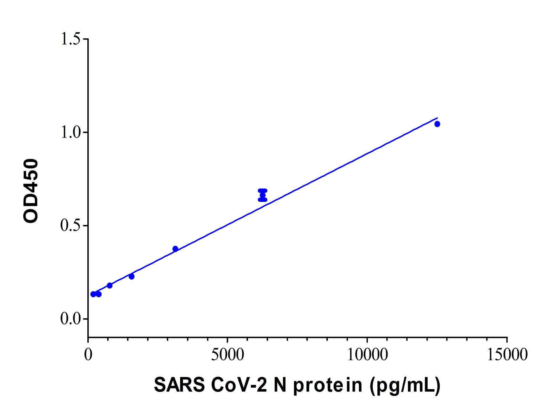 Sandwich ELISA detection of Recombinant SARS CoV-2 N protein (rp155931) using SARS CoV-2 N protein Mouse mAb (Ab155837) as capture antibody at concentration of 1.0 µg/mL. Biotinylated SARS CoV-2 N protein Mouse mAb (Ab176691) as detection antibody at concentration of 0.5 μg/mL. Detection of the standard curve was achieved by incubating Streptavidin-HRP (np156148).