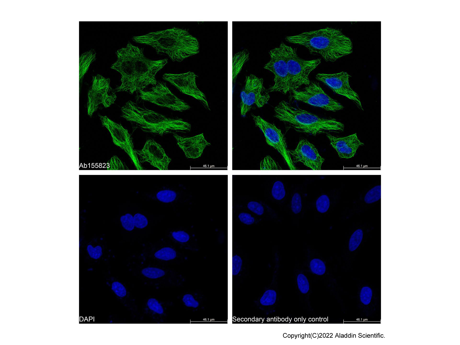 IF analysis of beta Tubulin (green) in HeLa cells. The cells were fixed and permeabilized with 100% methanol for 5 minutes, and blocked with 2% BSA for 1 hour at room temperature. Cells were stained with beta Tubulin Mouse mAb (Ab155823) at 1/2000 dilution in blocking buffer overnight at 4°C, and then incubated with Goat Anti-Mouse IgG H&L (Biotin) (Ab179002) at a dilution of 1/1000 for 1 hour at room temperature in the dark. Then incubated with Streptavidin Protein (FITC) (rp155876) at a dilution of 1/1000 for 1 hour at room temperature in the dark (green). Cells were counterstained with DAPI (blue). PBS instead of the primary antibody was used as the secondary antibody only control. Images were taken on the confocal laser scanning microscope.