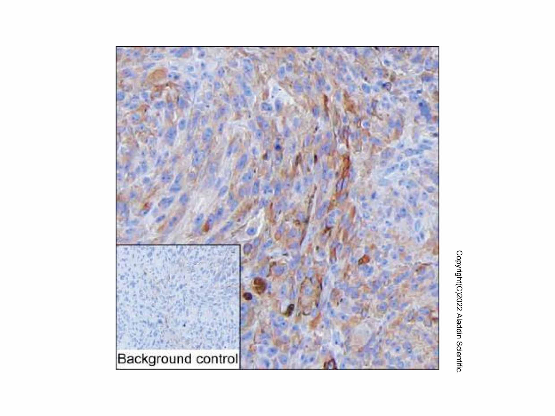 IHC-P analysis of malignant melanoma tissue by MelanA Mouse Antibody (Ab114904).IHC-P was performed using sections of the formalin-fixed paraffin-embedded malignant melanoma tissue. Antigen was retrieved through addition of boiling Tris/EDTA buffer pH 9 in a pressure cooker for 3 min. Endogenous peroxidase activity was quenched by incubating the sections with 3% H2O2 for 30 min at room temperature. The sections were then incubated with MelanA Mouse Antibody (Ab114904) at 5 µg/mL at room temperature for 1 h. Poly-peroxidase conjugated goat anti-mouse IgG was used as the secondary antibody. Diaminobenzidine was used as the chromogen. The section was counterstained with hematoxylin. A tissue section incubated with phosphate-buffered saline followed by incubation with the secondary antibody was used as the background control. Result: Tumor cells are positively stained at the cytoplasm.