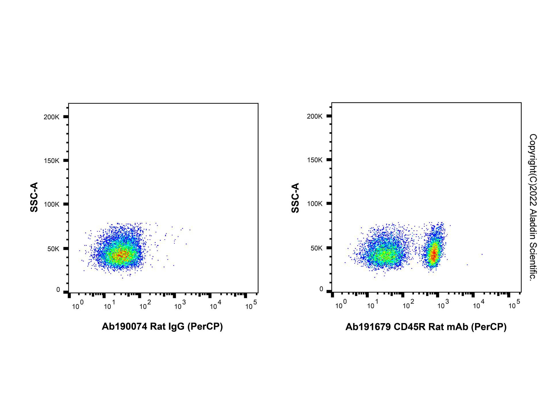 Flow cytometry analysis of CD45R expression by C57BL/6 mouse splenocytes (right panel) compared to an isotype control (left panel). Cells were stained with CD45R Rat mAb (PerCP) (Ab191679) at 0.3μg/test for 1 hour at 4°C. Left panel - Rat IgG (PerCP) (Ab190074).