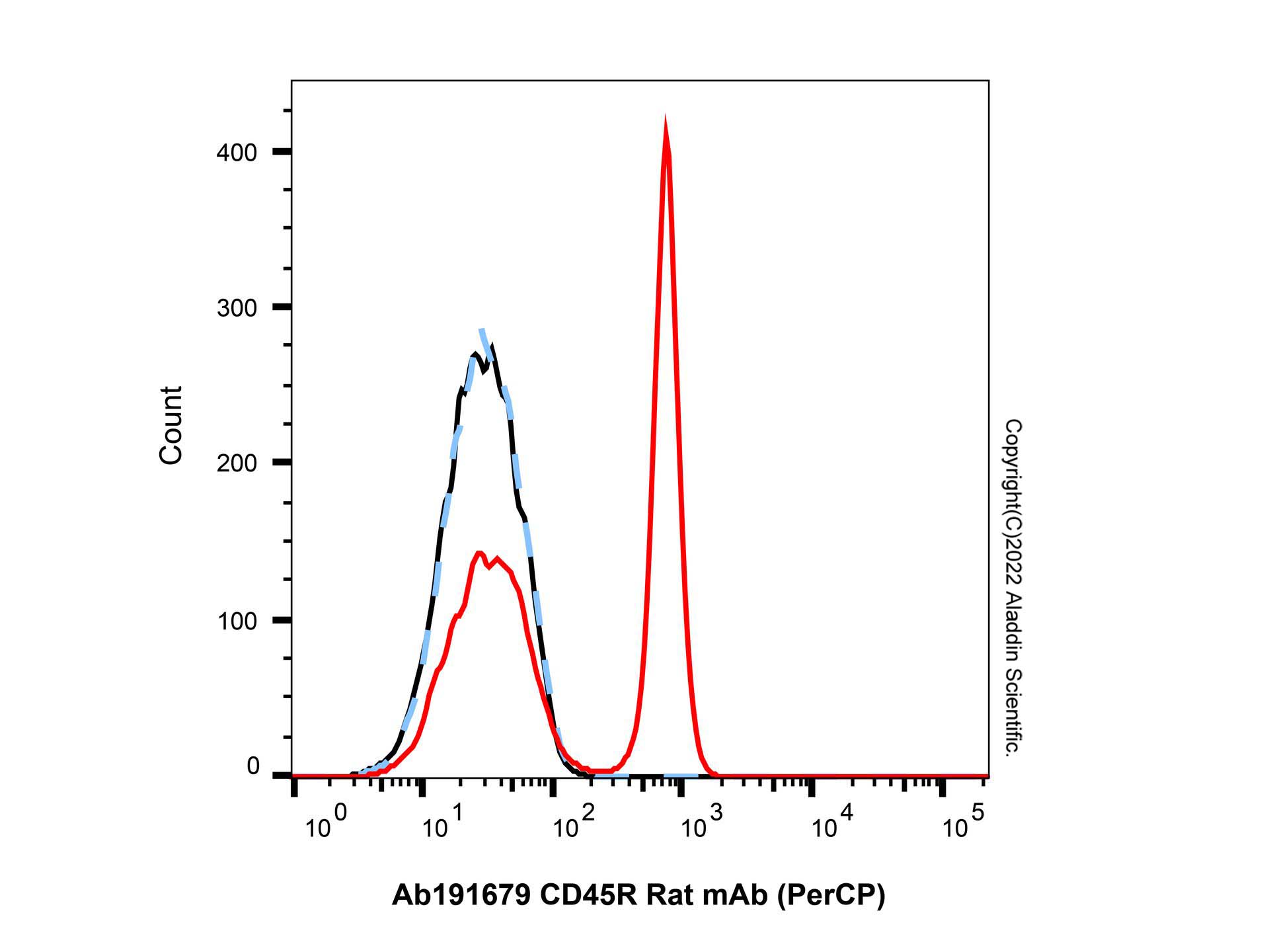 Flow cytometry analysis of CD45R expression by C57BL/6 mouse splenocytes (red) compared to an isotype control (blue). Cells were stained with CD45R Rat mAb (PerCP) (Ab191679) at 0.3μg/test for 1 hour at 4°C. Blue - Rat IgG (PerCP) (Ab190074). Black - Unlabelled control, cells without incubation with primary antibody.