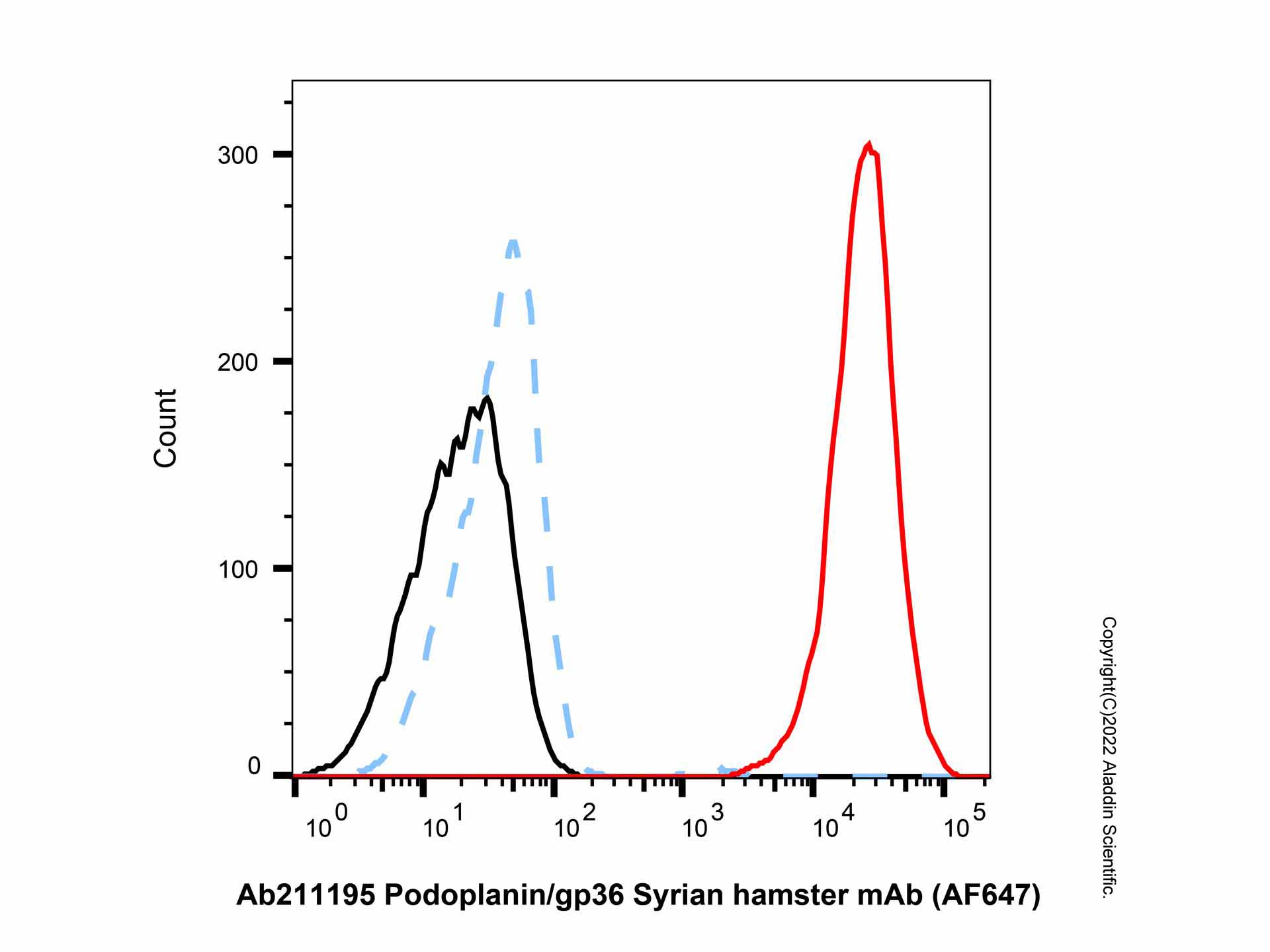 Flow cytometry analysis of Podoplanin/gp36 expression by C2C12 cells (red) compared to an isotype control (blue). Cells were stained with Podoplanin/gp36 Syrian hamster mAb (AF647) (Ab211195) at 0.05μg/test for 1 hour at 4°C. Blue - Syrian hamster lgG-kappa (AF647), anti-HEL (Ab212178). Black - Unlabelled control, cells without incubation with primary antibody.