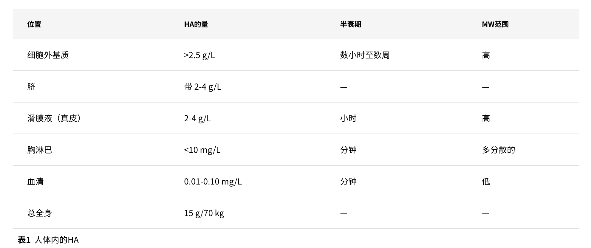 HA可与多种ECM分子相互作用,使其成为一种必要的结构成分,7 它可持续的从贯穿全身的成纤维细胞、角质形成细胞、软骨细胞和其他专门细胞中分泌,并被酶(透明质酸酶)所降解。10 下表列出了人体各种组织和体液中的HA含量及其半衰期和分子量范围。